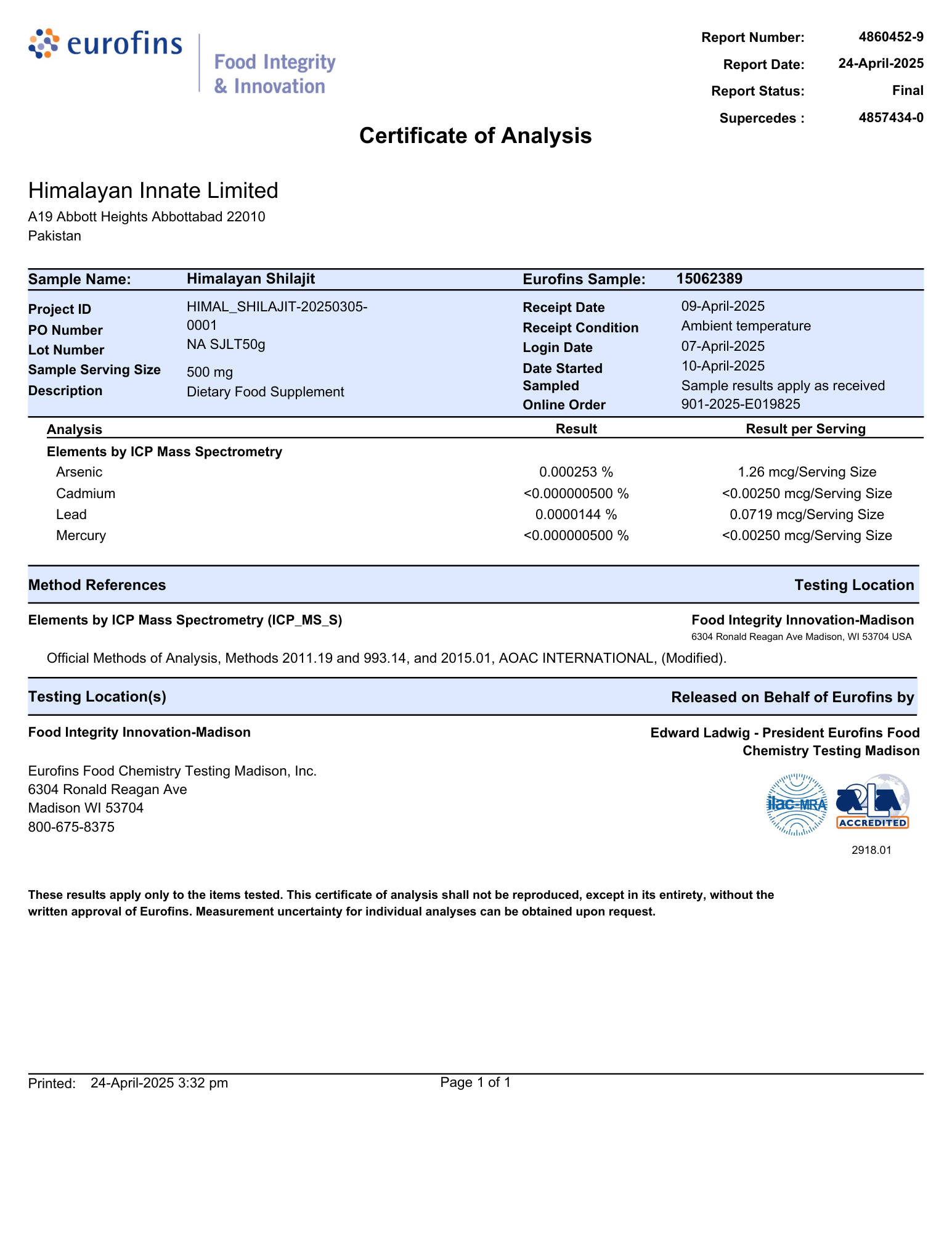At Prime Gold Shilajit, quality and safety come first. Every batch of our Shilajit resin undergoes comprehensive testing by Eurofins, one of the world’s leading independent laboratories. These reports verify: